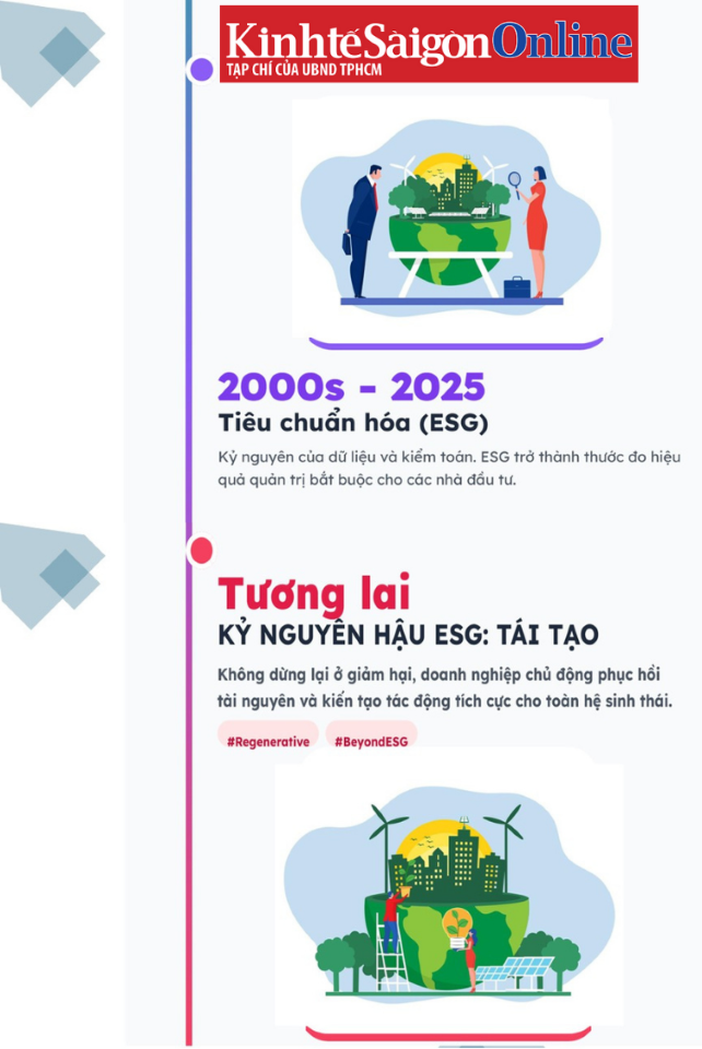 Và hiện nay, khi các giới hạn hành tinh bị đe dọa nghiêm trọng, các bên liên quan bắt đầu nhận thấy rằng việc chỉ dừng lại ở mức “giảm hại” của ESG là không đủ để đảo ngược tiến trình suy thoái. Do đó, một kỷ nguyên mới đang hình thành — Kỷ nguyên Hậu ESG: Tái tạo. Thay vì chỉ tập trung vào việc tuân thủ các chỉ số để bảo vệ giá trị cổ đông, các doanh nghiệp dẫn dắt đang dịch chuyển sang tư duy “tái sinh"” nơi mục tiêu tối thượng là phục hồi các hệ sinh thái và cộng đồng mà họ vận hành (7).