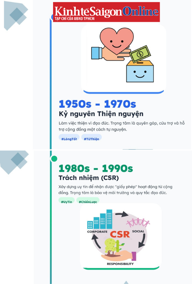 Các giai đoạn tiến hóa từ từ thiện thuần túy sang CSR. Đồ họa: Nhân Tâm. Nguồn: Tổng hợp