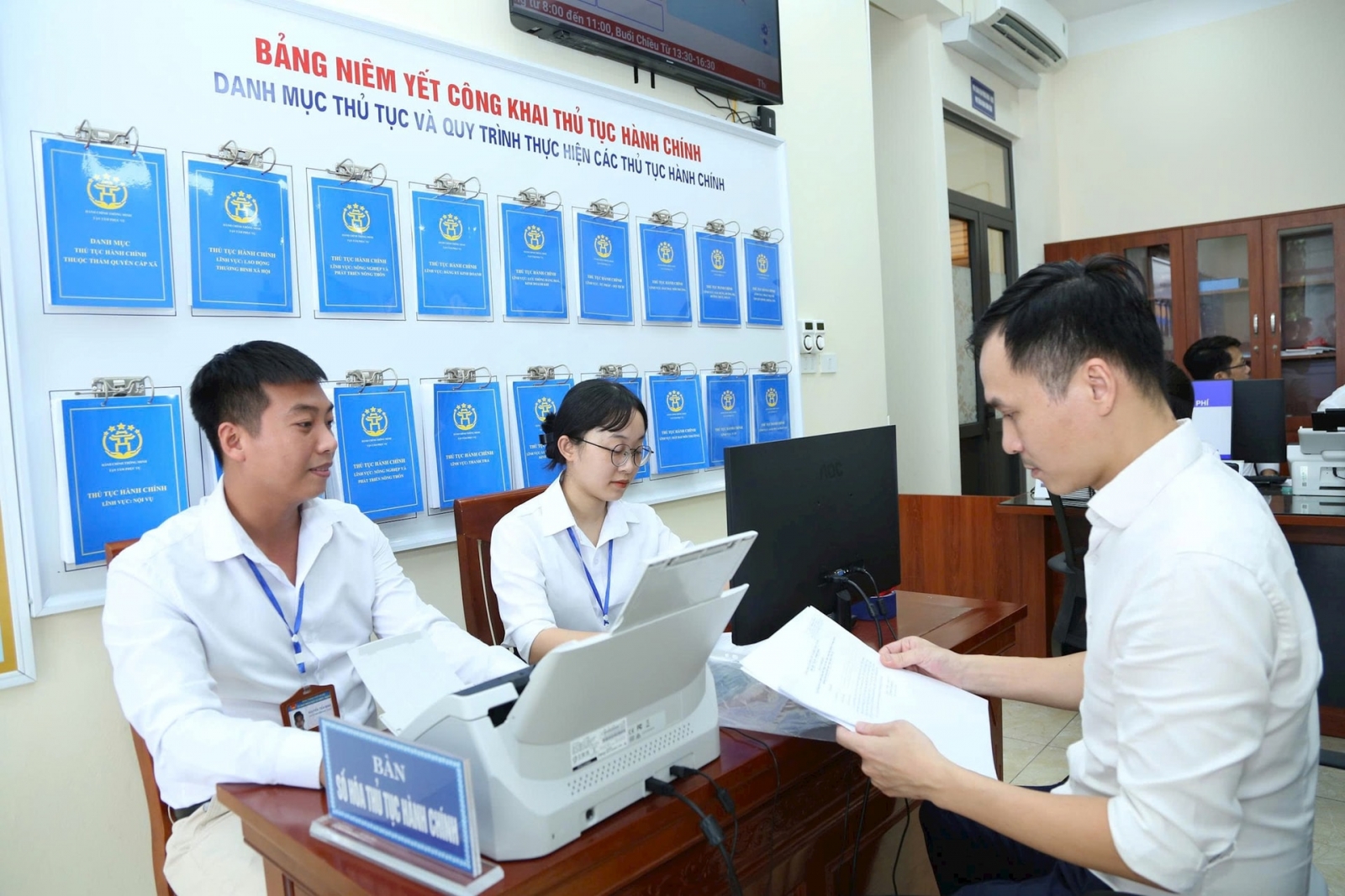 Cán bộ xã Phúc Thịnh, Hà Nội, giải quyết thủ tục hành chính cho người dân. Ảnh Phạm Hùng