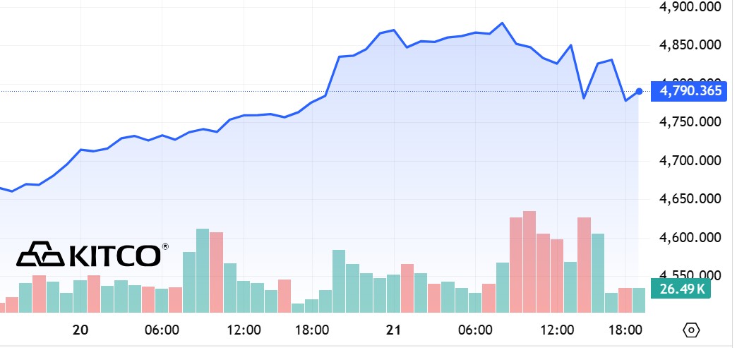 Giá vàng giao ngay ở mức 4.783 đô la mỹ/ounce (tính đến khoảng 7h sáng ngày 22-1). Giá vàng đã giảm khoảng 105 đô la/ounce, tương ứng khoảng 2,1% so với mức đỉnh lập ra vào ngày 21-2.